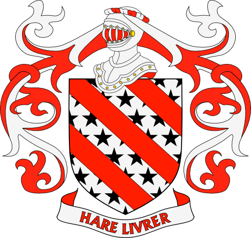 De plata, estrellado de sable, brochante sobre el todo, tres bandas de gules. Por divisa: HARE LEVRIER