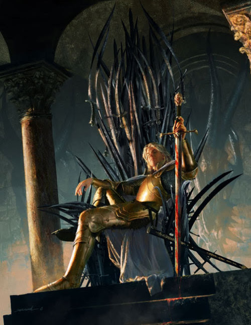 La casa Lannister. El Rey Robert Baratheon está casado con una mujer de la casa Lannister. Durante la cena celebrada cuando el Rey va a visitar a Ned Stark para informarle que será el siguiente Mano de Rey, título que designa al segundo de a bordo del reino, se explica que la casa de Lannister lleva un león dorado sobre fondo carmesí.  Así que estas son las armas imaginarias de los Lannister: